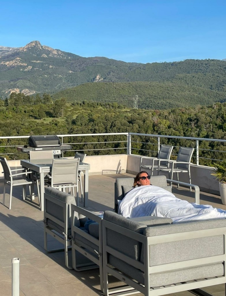 Ici, je suis réveillée tôt et mon kiffe c’est d’ouvrir les volets pour découvrir le temps et surtout quel nouveau tableau se dressera devant moi. 5 semaines: chaque jour un tableau différent. Ce que j’aime par dessus tout, c’est ce calme. J’ai l’impression d’être dans une bulle entourée de la montagne, des oiseaux qui chantent, de la mer et de cet air frais de nature. Au fur et à mesure que les semaines et les températures augmentent, j’ai la joie de pouvoir profiter du soleil ☀️ matinal. Conditions idéales pour méditer et/ou écrire ou prolonger mon sommeil en extérieur ! #Lepouvoir du matin