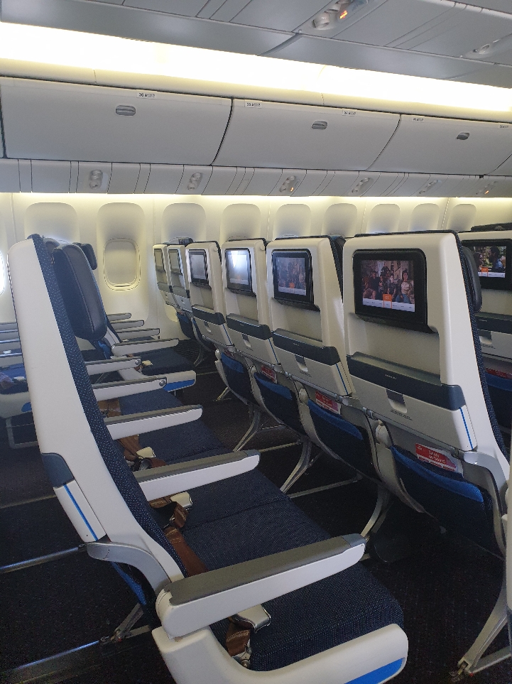 Le vol est littéralement vide. Nous sommes 75 dans un 777, ça j’ai jamais eu ! Pas besoin de se renseigner sur un éventuel surclassement, on a une rangée chacun pour nous