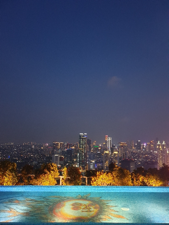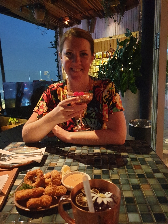 Arrivés dans notre nouvel hôtel, notre but c’est la piscine 😀. Et bien…elle est belle et on la contemplera seulement de notre fenêtre car Covid oblige, elle est fermée 😝😝. Bon ben l’occasion de se poser un peu avant de prendre du bon temps sur le Skye, un rooftop sympa qui où on réalise que ça y est, on y est. Santé !