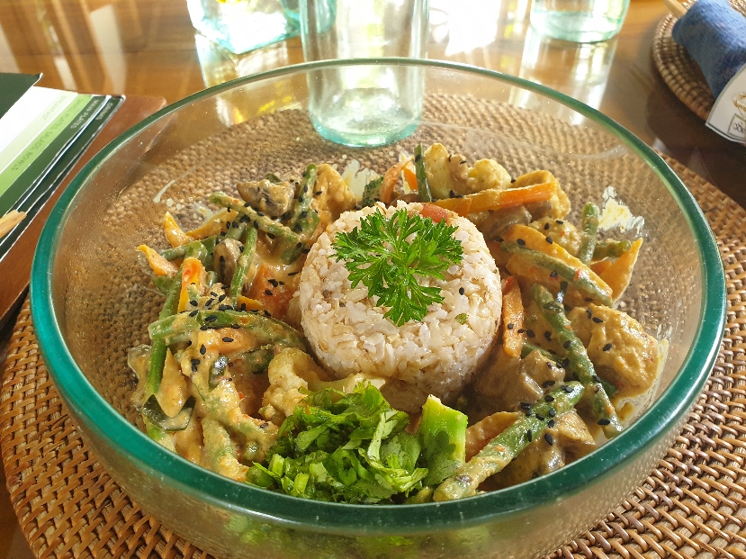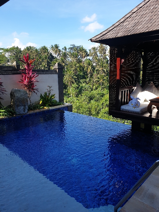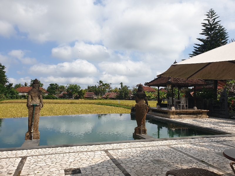 On passe bien 2 heures à serpenter les rizières puis l’appel du ventre se fait sentir 🤪. Oui mais euhhh là il n’y a pas grand chose d’ouvert…C’est ainsi que je vais me transformer en visiteuse d’hôtel. Et oui l’Homme c’est son métier ! J’avais déjà été son accolyte lors d’un EducTour Américain et j’avais adoré faire ça !! C’est reparti donc et là c’est la version plus plus qu’on va tester : le Viceroy. Au milieu de nulle part en haut sur la colline entourée de jungle se trouve le Viceroy. Nous sommes accueillis par Made qui nous raconte l’histoire du lieu et nous le fera visiter…. après une pause déjeuner ! Car là, la transformation en mode Hulk est entrain de s’opérer !!!