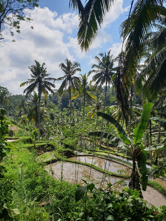 Petit arrêt jus de bananes pour recharger ma batterie. Ça me permet d’admirer la vue et de voir qu’en contrebas, il y a un sentier qui semble aller dans les rizières. Let’s go ! Sur notre chemin on croise deux femmes qui s’essayent à la balançoire. La mini rando dans les rizières me fait me poser une question : cet endroit est il construit de toute pièce ? Je n’ai pas la réponse. Je pense que les rizières étaient là et qu’elles ont été « équipé » et embellie. En tous les cas, la nature embellie ou pas reste pour moi vivifiante et inspirante