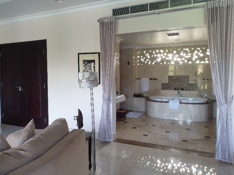 Une fois revenue à mon état normal, nous visitons l’hôtel qui a son propre jardin et sa propre serre pour fournir la cuisine. J’adore. La chambre qu’on nous fait visiter euh pardon la villa!! surplombe la forêt tropicale, fait je pense 70m2 et a sa propre piscine !!
