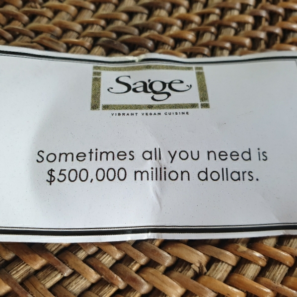 Je ne me suis pas rendue compte de la chaleur avec le voyage en scooter et j’ai d’urgence besoin de nourriture. Ici, certains restaurants sont ouverts. Dont Sage, un des mes petits restos vegan fétiche où le port des chaussures est optionnel et ça j’adorrrrrreee. On s’y pose et j’y reçois un drôle de message !
