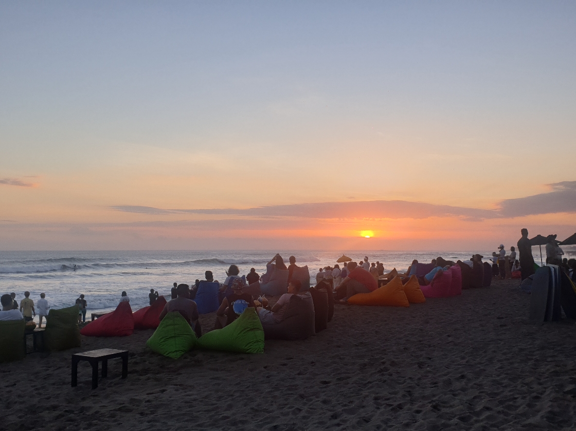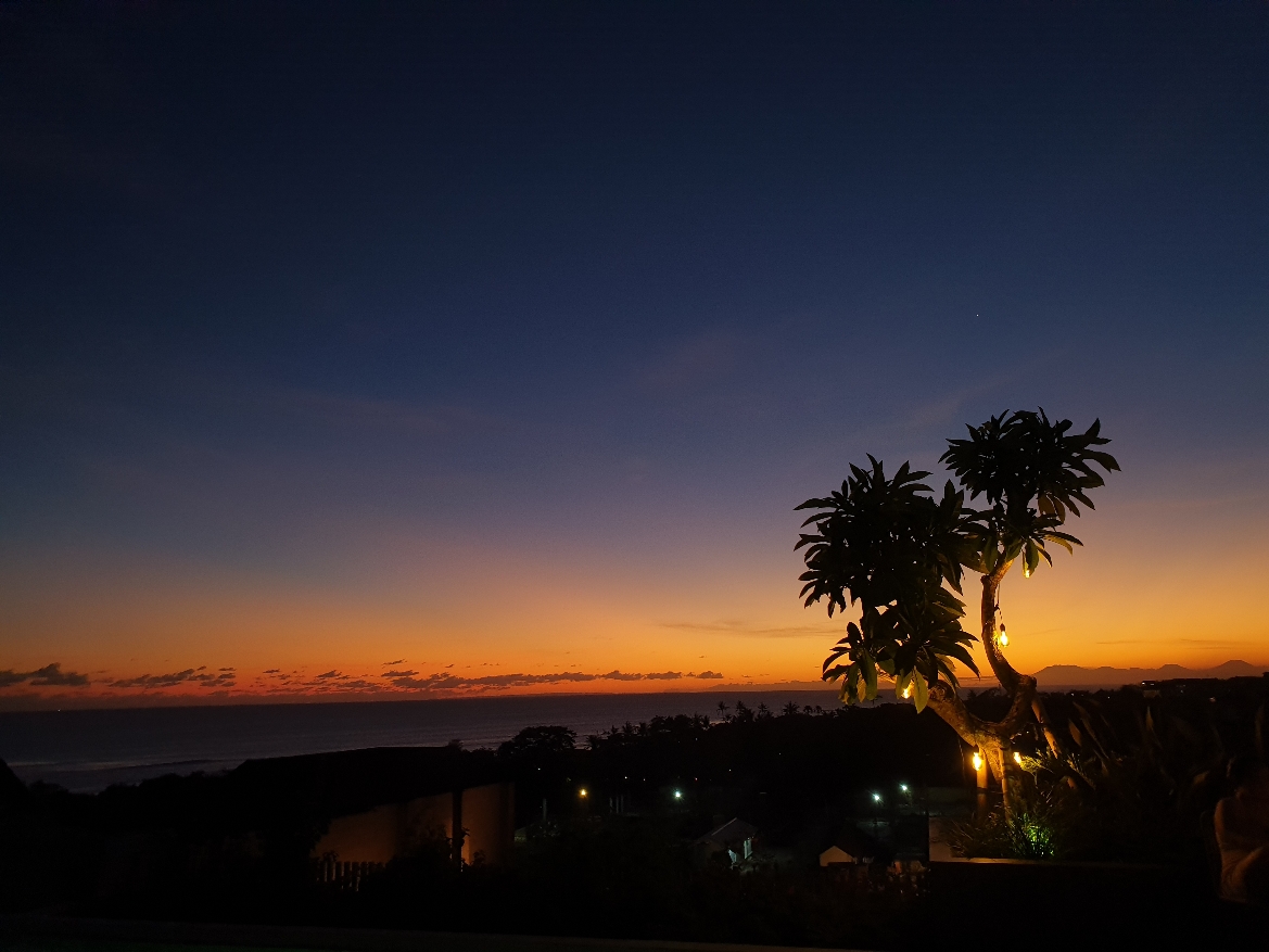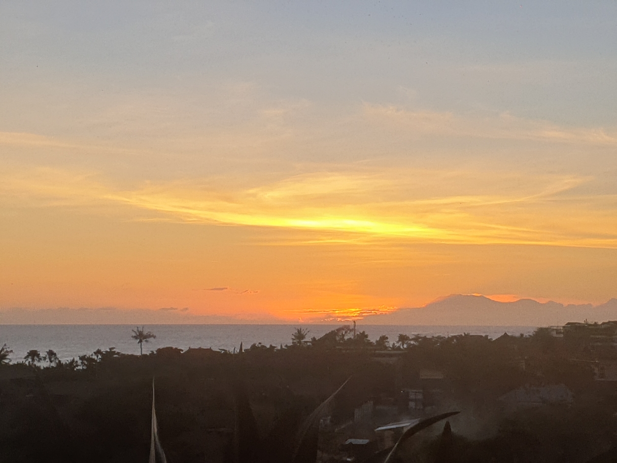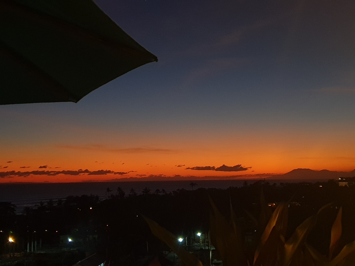 C’est aussi pendant cette période là que j’ai vu le plus beau coucher du soleil. Je l’ai classé numéro 1. L’hôtel Citadines se trouve à quelques mètres de la plage de Berawa fermée. Il dispose d’un rooftop. Qui ne tente rien à rien…on essaye et oui on peut boire un verre. Parfait car la golden hour va commencer. Aujourd’hui, le ciel est entièrement dégagé. Sur le toit on a une vue à 360 degrés. En prenant de la hauteur, je peux comtempler encore plus la beauté et les trésors de l’île. Les volcans, les montagnes. Le soleil se couche sans aucun nuages. C’est splendide, magnifique, un vrai cadeau 🌅