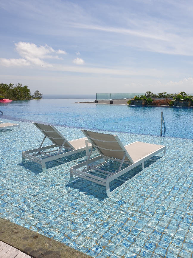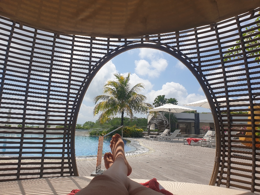 Après la traditionnelle visite de l’hôtel pour les besoins business de l’homme, on se pose à la piscine avec vue