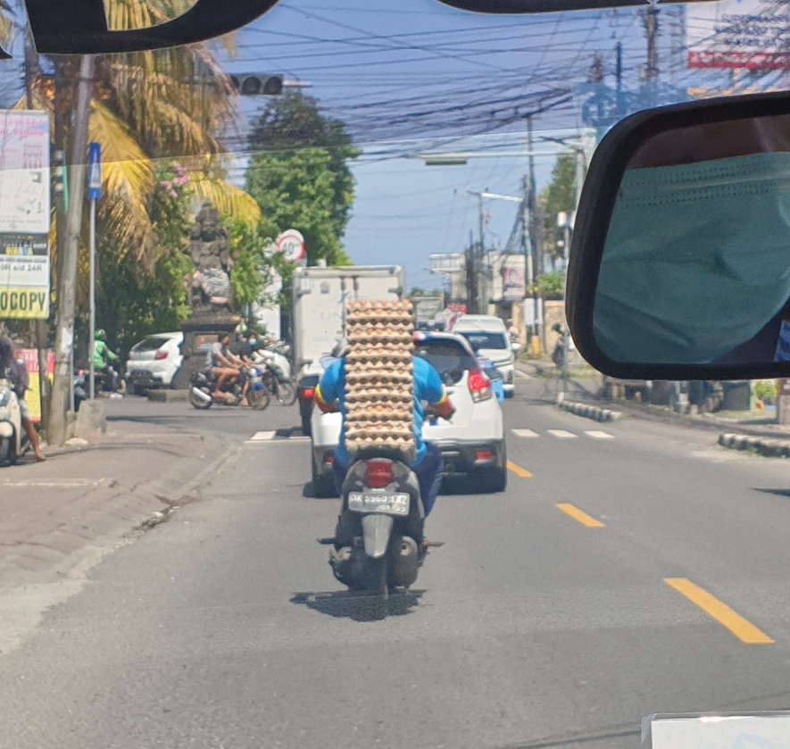 Sur le chemin pour s’y rendre, les scooters sont de la partie et bien sûre je reste épatée de tout ce que les balinais arrivent à faire tenir sur ces engins. J’ai déjà vu un scooter avec 4 personnes dessus dont une mère qui donnait le sein à son bébé ! Et là devant nous, c’est l’équilibre des oeufs. Comme quoi, il semble qu’aller avec le flow et l’équilibre ça fonctionne tout simplement