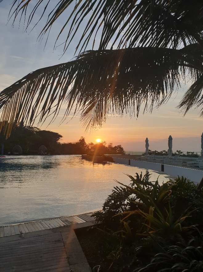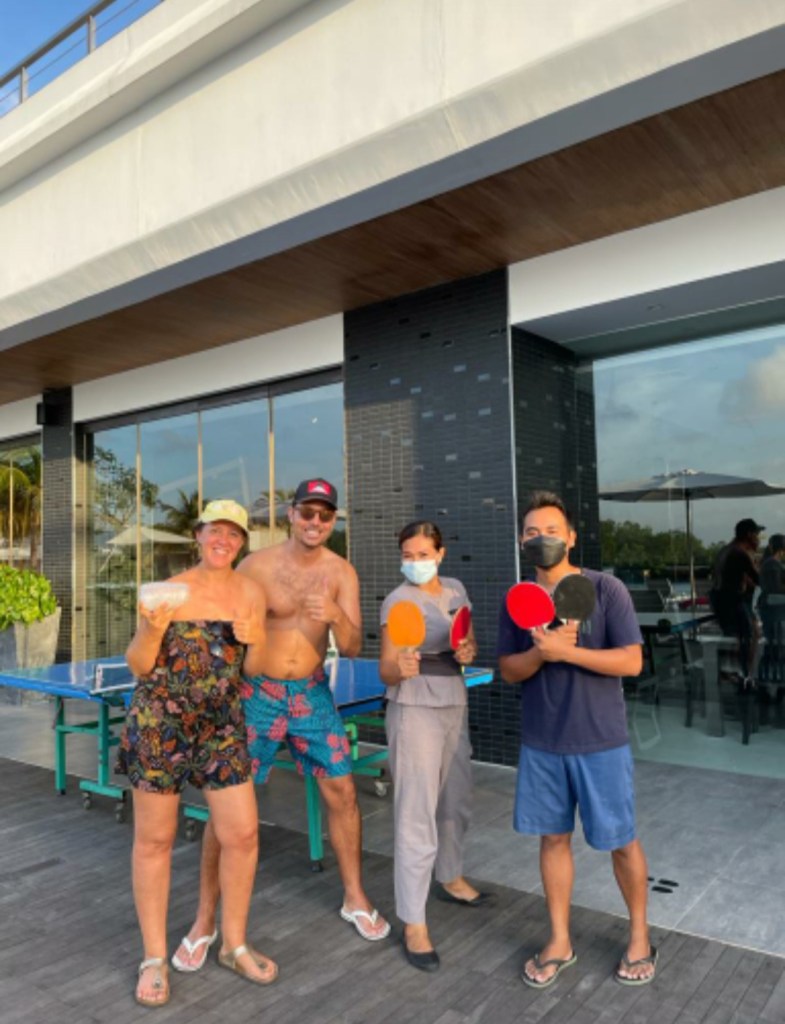 17h : on nous propose un tournoi de ping pong. Nous deux contre l’équipe de l’hôtel. En jeu : un bol en terre cuite rose. Je le veux ! Mode winning activé 😃. On est tous à fond et l’ambiance est bon enfant. Ça fait tellement du bien de refaire un truc normal !! J’ai failli perdre un oeil quand mon adversaire m’a envoyé la balle en mode rafale, heureusement que j’avais mes lunettes de soleil. Puis, j’ai hérité d’une belle bosse au coude quand Chéri a confondu balle et être humain que je suis. Mais on a gagné ! C’était un super moment 🥳