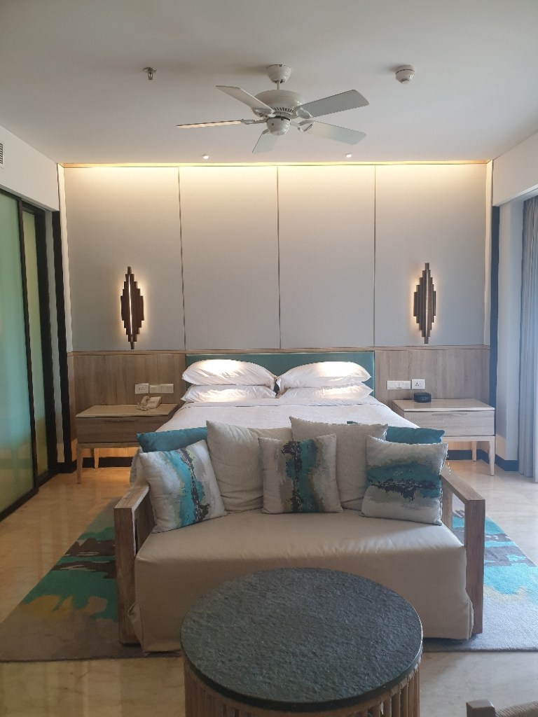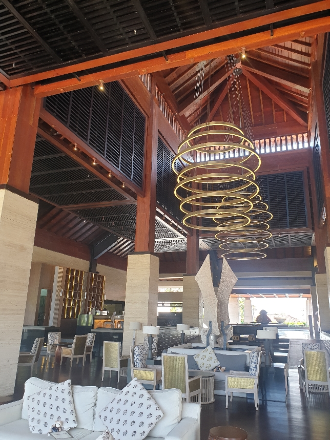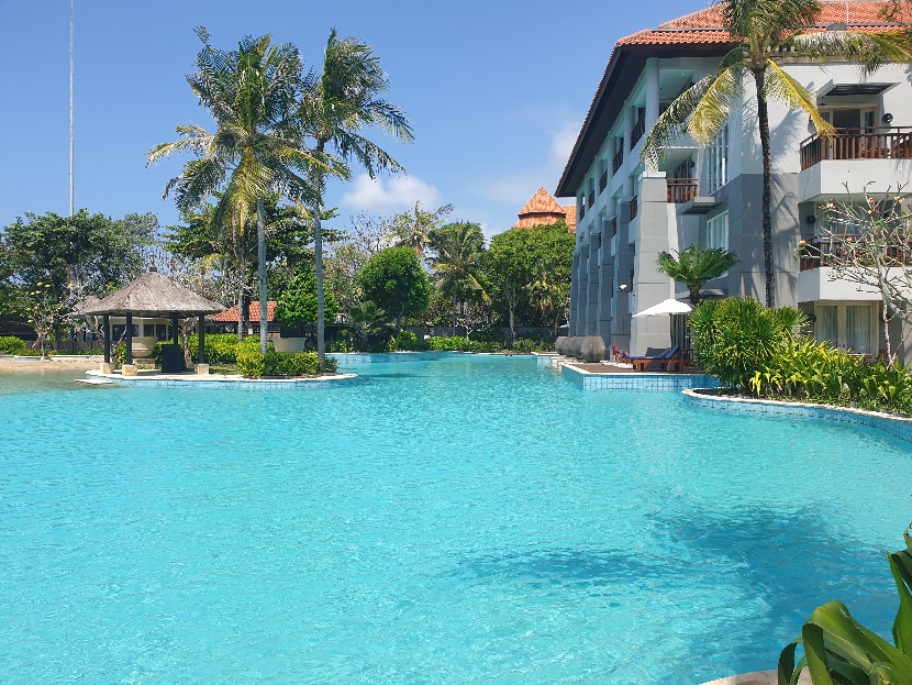 Arrivés au Conrad hôtel. Il est grand…très grand. En tout je crois qu’il a 4 énormes bâtiments. Impressionant, je l’ai surnommé le Queen Mary II terrestre. On ne l’a pas réservé avant celui là. On fait ça maintenant. On arrive, on visite et on voit. Sauf qu’avec la pandémie à Nusa Dua, il n’y a pas grand choix donc après trois visites, on opte pour celui là.