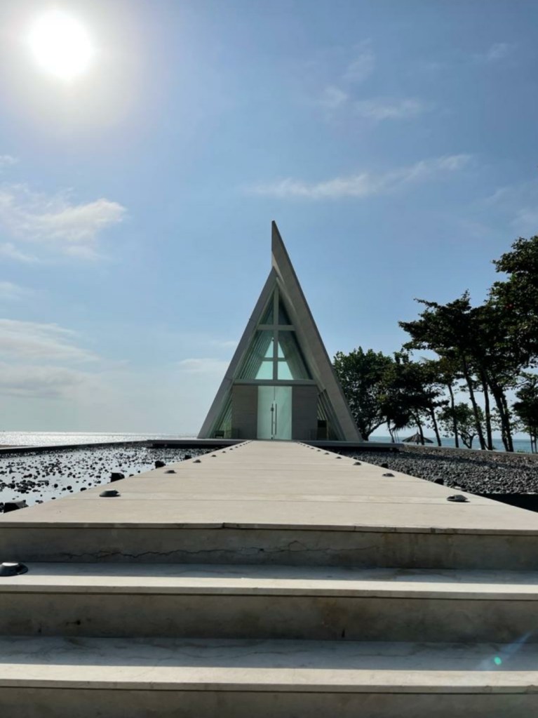 Ce matin, on part voir un peu autour de l’hôtel il y a un sentier pavé qui longe la mer. Tiens mais qu’est ce que je vois là à quelques mètres, me dis-je. Et ça fait partie de l’hôtel en plus. Une sorte de bâtiment blanc en forme de triangle. Quoi !! ??? Ne me dites pas qu’on est tombés dans un hôtel de scientologues !!! Nannnnn en fait on s’est rapprochés et c’est leur propre chapelle avec vue sur l’océan pour les mariages. Ahhhhhhh