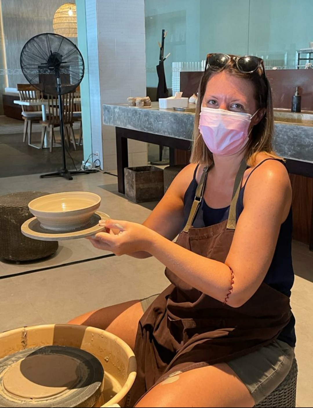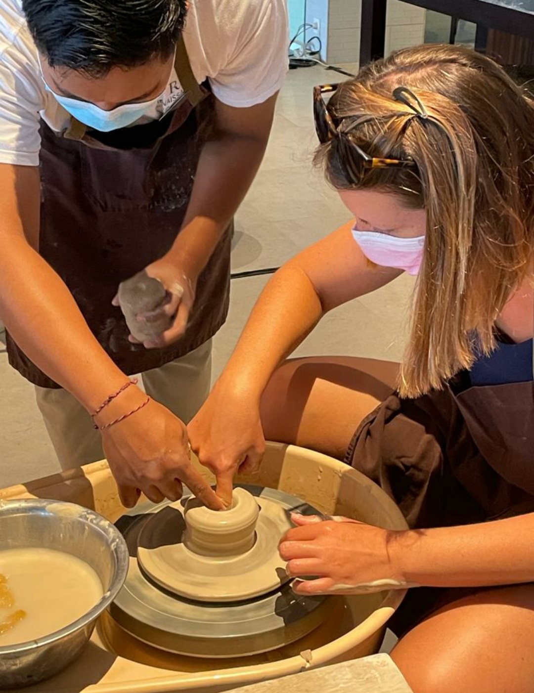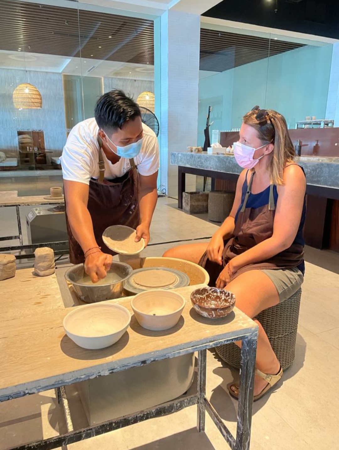 11 heures : j’ai vu qu’il y avait une animation poterie. Oui, car pour une raison inconnue (j’ai oublié de demander ), cet hôtel dispose de son propre atelier de poterie. Je suis super contente. Allez hop, mon tablier enfilé, l’animateur nous fait une démo puis c’est à notre tour. Quand mes mains touchent la terre, la musique de Ghost commence dans ma tête….nan je rigole lol. Je suis plutôt en mode comme quand on apprend à conduire : à faire attention à tout ce qu’il faut pour produire un objet. Tadaaaaaaaaaaaaaaa