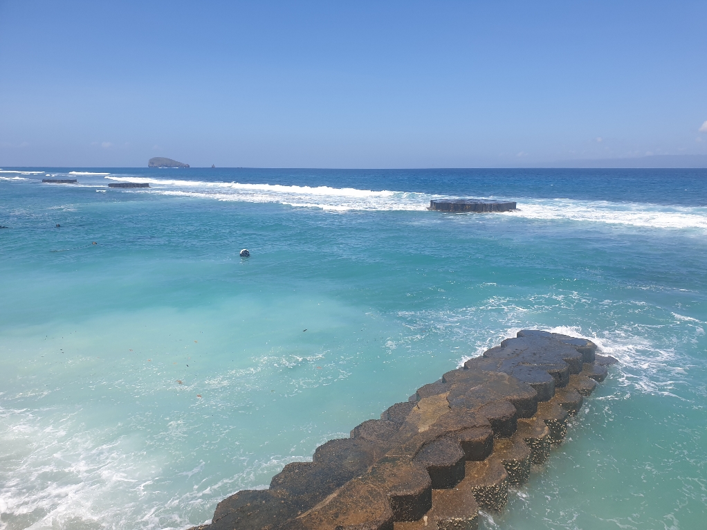 J’ai bien évidemment emmené mon équipement de snorkeling seulement j’ai l’habitude d’en faire en eaux calme. Là ça bouge quant même. Bon bon je prends d’abord un bain de soleil et j’étudie la technique de l’Homme, qui lui, fait déjà parti des poissons dans l’eau.