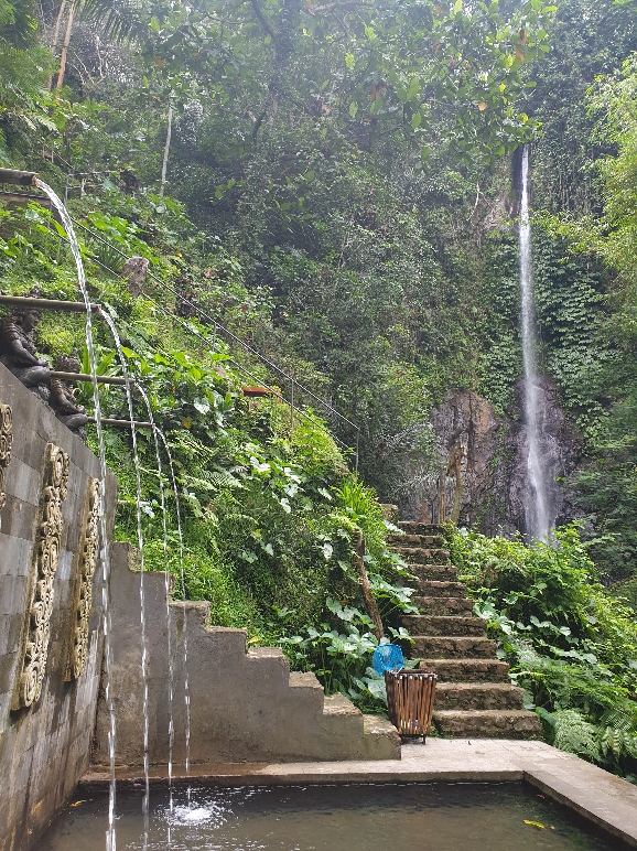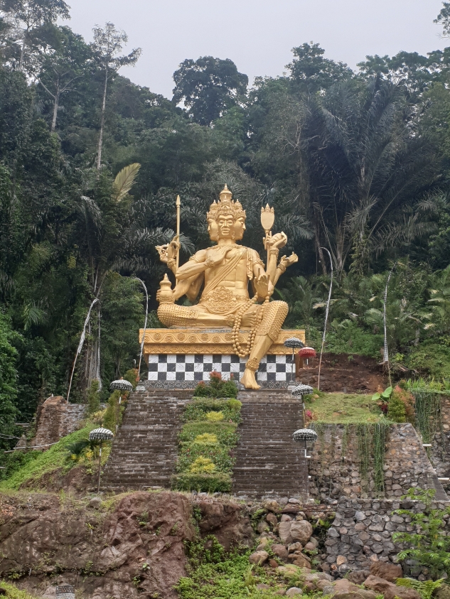 Puis direction la cascade. De loin, j’aperçois la statue dorée qui indique son emplacement. Elle a l’air énorme et belle. On finit par laisser le scooter pour terminer à pieds. Quand on arrive à la cascade de Jagasatru, quelques locaux sont là. Pas de droits d’entrée une simple participation est demandée pour descendre les 145 marches et arriver au Graal.