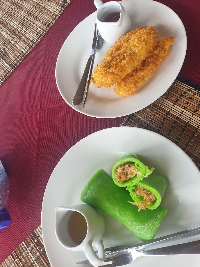 C’est l’occasion pour nous de manger local. Notamment un de mes kiffes : le Dadar Gulung ! Sorte de crêpe verte fourrée à la coco râpée.